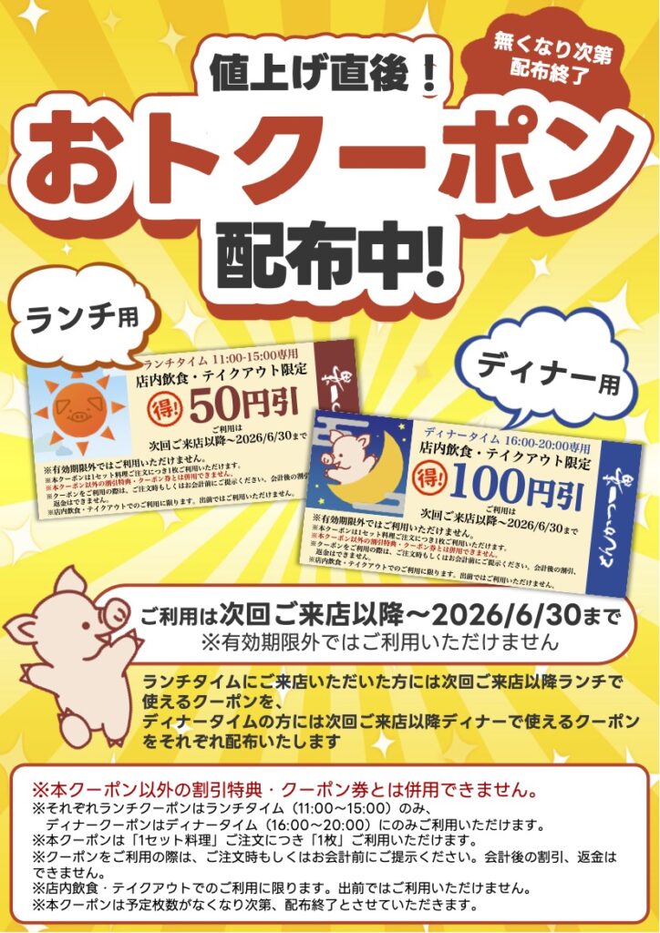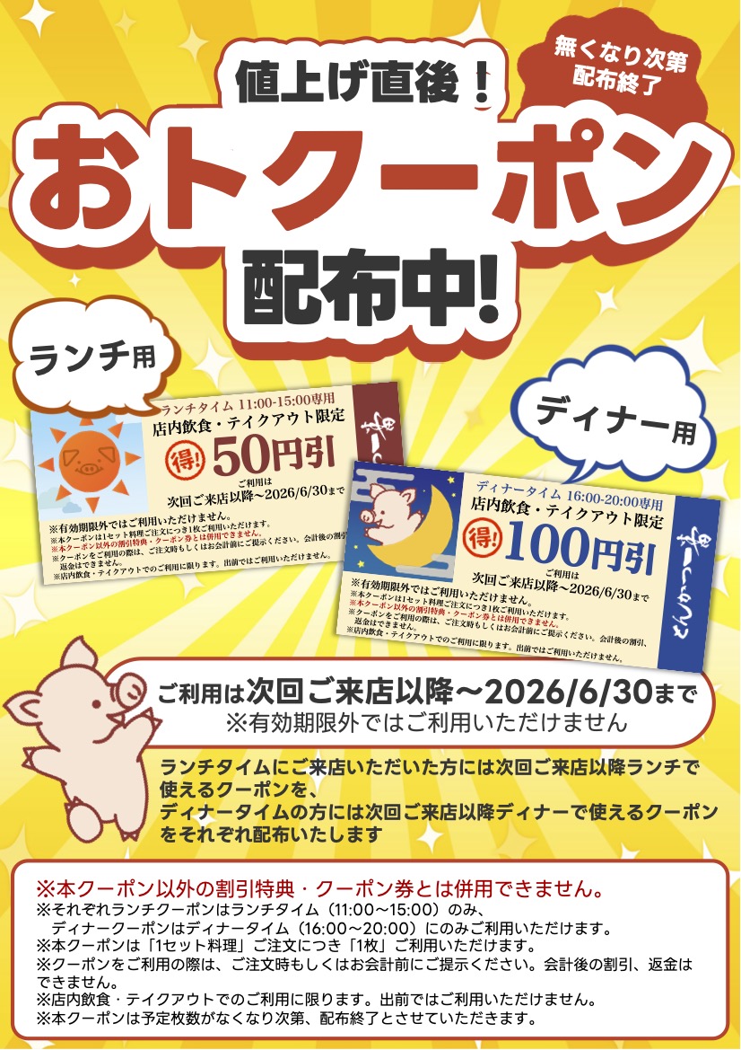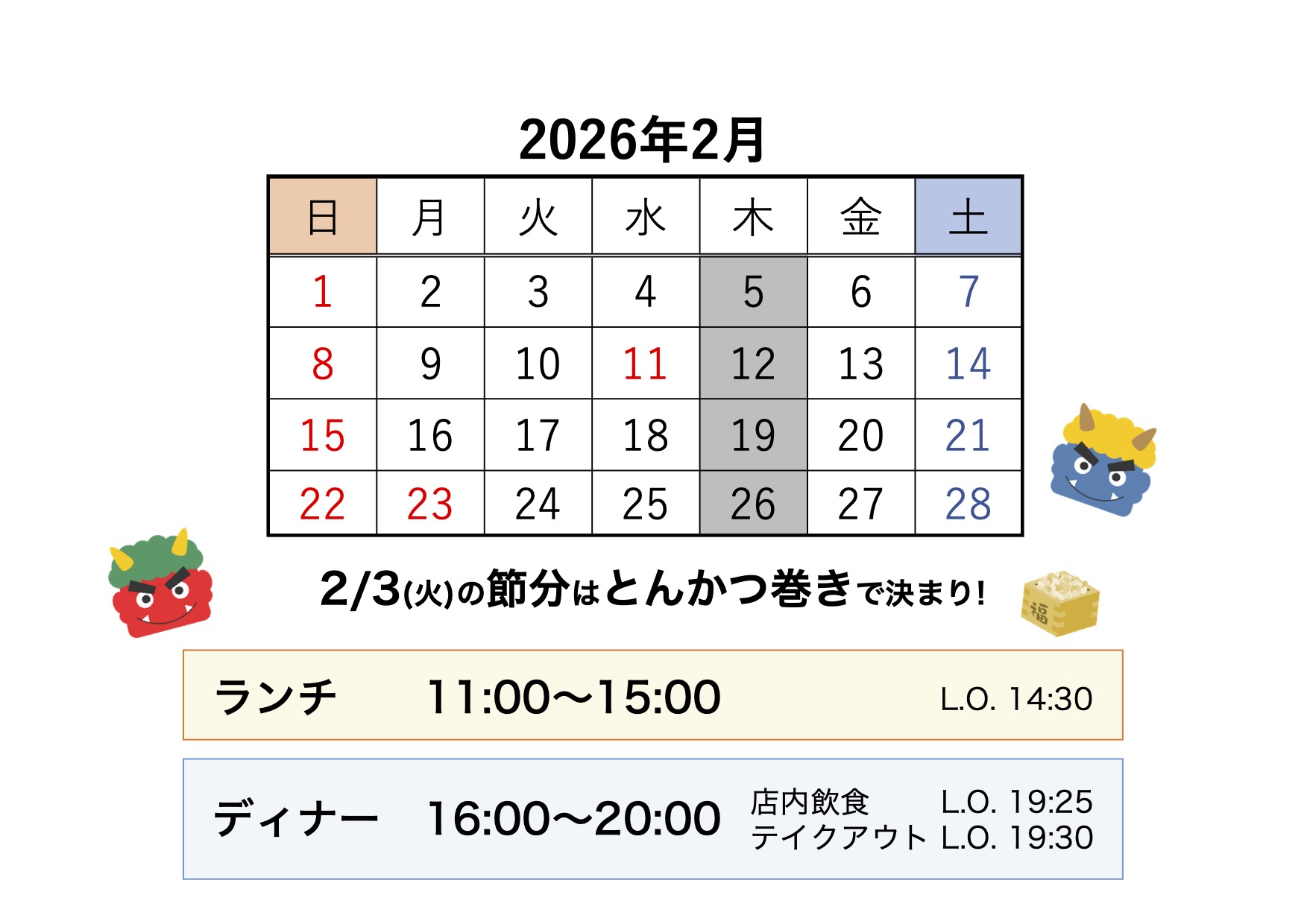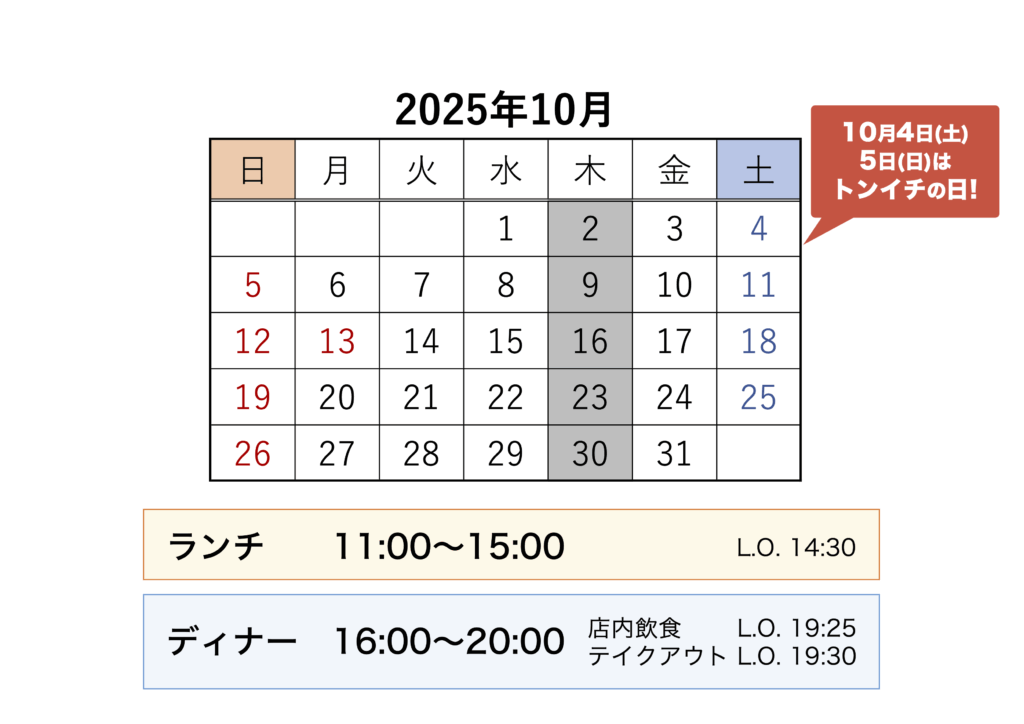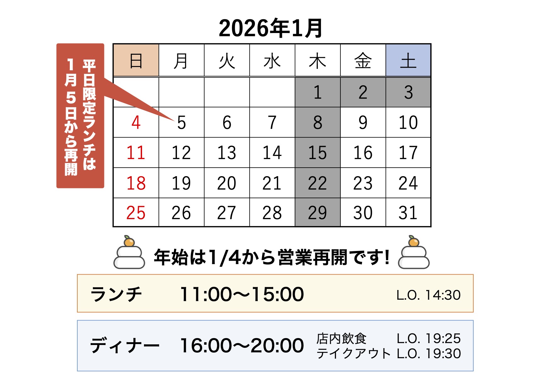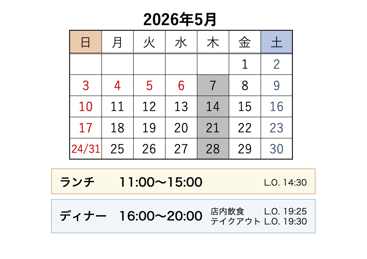 ディナー 16:00~20:00 (店内飲食 L.O.19:25/テイクアウト L.O.19:30)